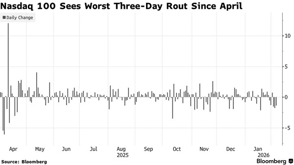 这一次并不存在单一的触发因素,不像去年4月那样,由美国总统特朗普(Donald Trump)发动的贸易战曾令市场陷入恐慌性动荡。相反,是一连串持续不断的消息在慢慢累积,激发了人们对估值的焦虑——而这种估值本就被许多人认为已经涨得过高——最终导致投资者同时选择收缩战线。 这一点在周四(2月5日)再次显现:标普500指数下跌1.2%,连续第三个交易日收跌;纳斯达克100指数则扩大跌幅,创下自4月以来最严重的一轮回调。随着人工智能初创公司Anthropic推出一款旨在执行金融研究的新模型,软件股的跌势进一步加深。这已经是该公司本周第二次令市场震动,凸显出新技术带来的激烈竞争威胁。