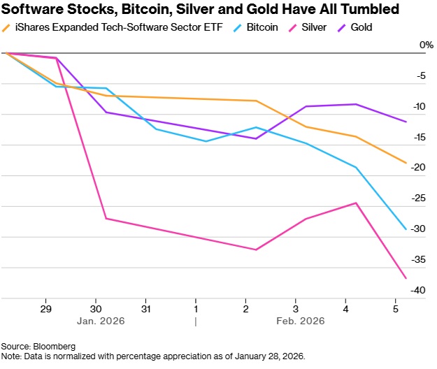 (软件股、比特币、白银和黄金均大幅下挫 来源:彭博)