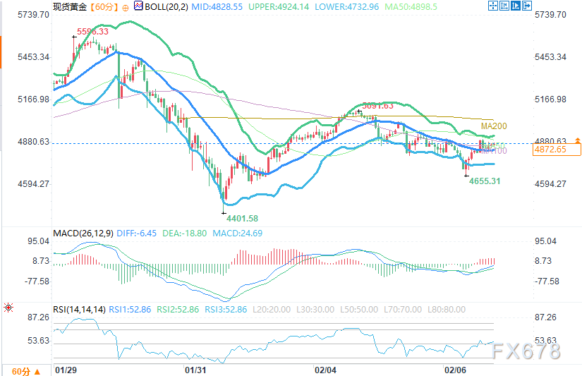 1小时图上,金价经历大幅暴跌后,在4650-4700美元区间形成局部底部并开启修复行情,当前价格重回布林带通道内,且在4820-4850美元的布林带中轨附近震荡整理。从走势来看,当前金价反弹属于修正性行情,市场波动率持续回落,多空力量暂时处于均衡状态。