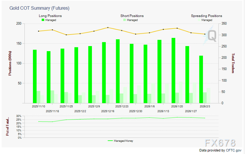 (COT黄金管理资金账户持仓趋势图,2月2日暴跌后净多头受损严重)