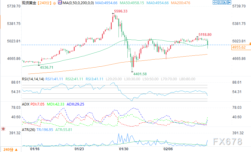 4小时图上,现货黄金正测试50期均线(4958.24)支撑。下一关键支撑看向4850美元附近,随后是200期均线(4956.476)。若失守该位置,下行空间或将进一步打开。