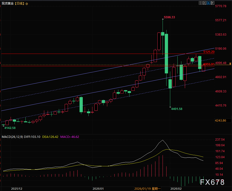 技术面现货黄金价格在通道下轨获得强力支撑,目前回到本波上涨的0.618分位,仍处在强势区间,同时关注5125重要点位,此位置是黄金重要的压力位也多空分水岭。
