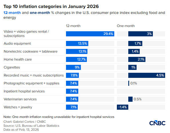 不过,经济学家普遍预计,1月通胀数据不会促使政策制定者加快降息节奏。 牛津经济研究院首席经济学家伯纳德·亚罗斯(Bernard Yaros)在周五的一份报告中表示:“1月CPI低于预期,对美联储而言是个好消息,但我们不会因为单月通胀读数就调整货币政策的基准预测。停摆引发的价格数据扭曲仍未完全消退,今年增长前景稳健,就业市场趋于稳定,这些因素将使央行保持观望,直至6月。”经济学家指出,部分商品与服务的通胀正在缓和,但另一些类别的涨势仍然偏高。