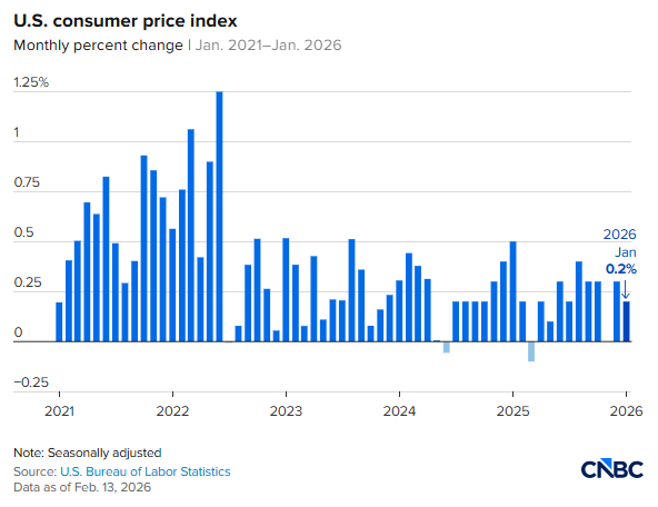 FX168财经报社(北美)讯 美国通胀再度释放“降温”信号。最新数据显示,1月整体CPI环比仅升0.2、同比回落至2.4%,均低于市场预期;剔除食品与能源后的核心CPI同比降至2.5,创2021年3月以来最低水平,接近疫情前区间。数据公布后,市场对美联储年内宽松的押注明显升温,交易员预计4月前降息概率约30%,而6月前启动降息的可能性已跃升至80%。
