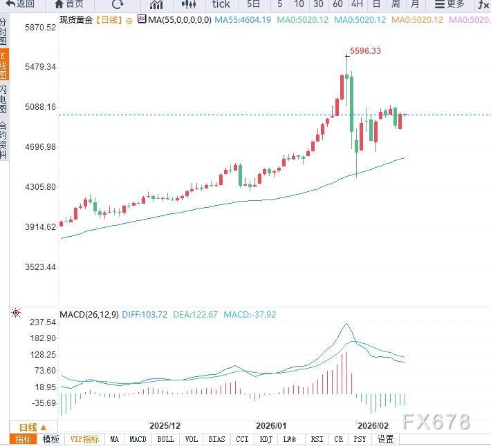 从日线结构来看,金价在经历剧烈波动后进入高位震荡修复阶段。5000美元整数关口已成为重要心理支撑位,目前价格围绕该区域展开拉锯。