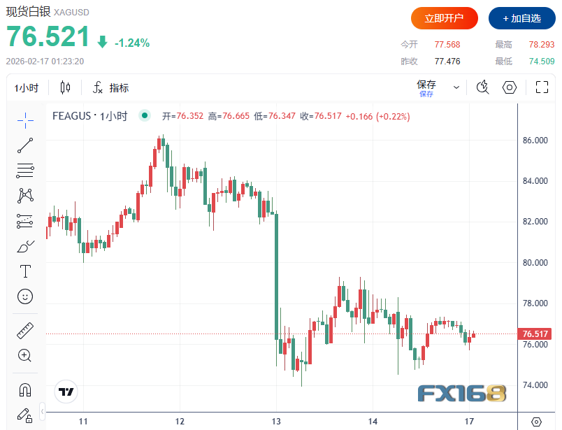 白银市场同样交投清淡。现货白银最新报76.521美元/盎司,日内下跌1.24%,日内稍早一度触及74.509美元/盎司。相较黄金,白银面临更明显的“上方压力”,因其未能站稳80美元关口,且较上月高位已有明显回落。