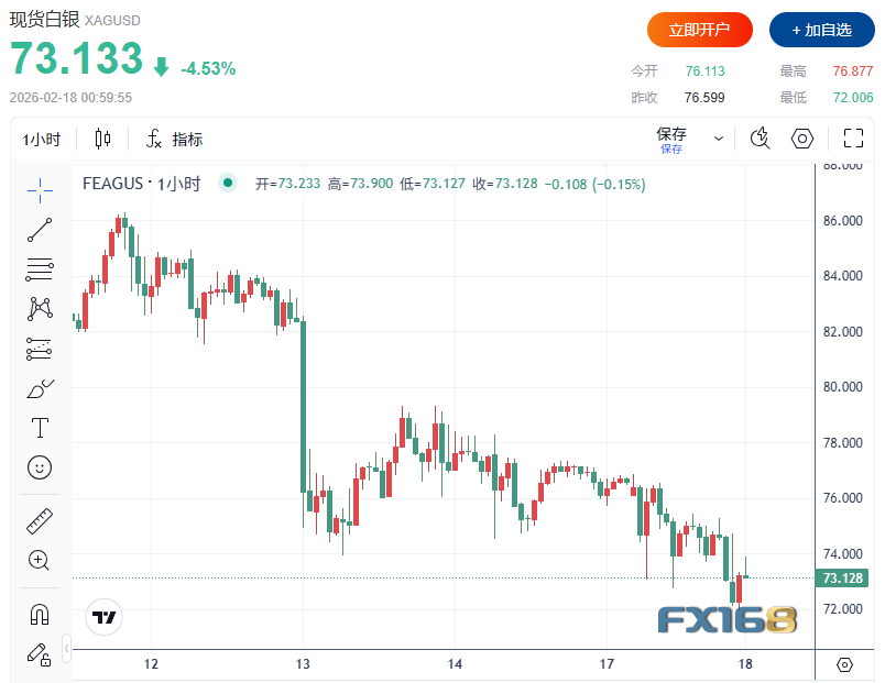 对黄金而言,利率预期的意义在于:黄金不产生利息,利率下降通常意味着持有黄金的机会成本降低,进而提升配置吸引力。因此,若纪要释放更偏鸽派信号,可能削弱美元并对金价形成支撑;反之若偏鹰,则可能继续强化美元、压制贵金属反弹力度。 Evangelista补充称,在地缘与经济不确定性仍可能支撑中长期避险需求、且美元存在偏鸽预期的背景下,他倾向于认为金价将维持在5000美元上方进行整理,并在年内向6000美元方向延伸。 农历新年假期使亚太多地市场休市,包括中国内地、香港、新加坡、台湾以及韩国。这类“假期周”往往意味着流动性下降、盘口更薄,价格更容易对美元波动与突发消息作出放大反应,也解释了当天金银盘中出现较大振幅的原因之一。白银走势更为剧烈。现货白银下跌超6%,最低触及72.006美元/盎司。从跨资产属性看,白银既具贵金属避险属性,也受工业需求与资金流动性影响更大,因此在“美元走强+假期流动性偏弱”的组合下,波动常常被进一步放大。