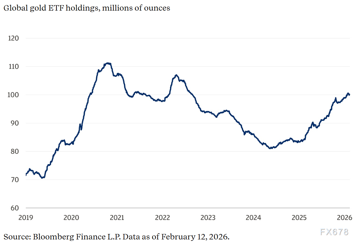 (全球黄金ETF持有量,单位:百万盎司 数据截至2026年2月12日)