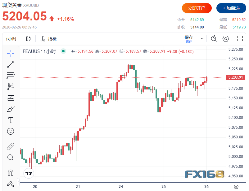 受避险买盘涌入影响,周四(2月26日)亚欧时段,现货黄金震荡上行,现交投于每盎司5195美元附近,日内涨幅约0.65%。