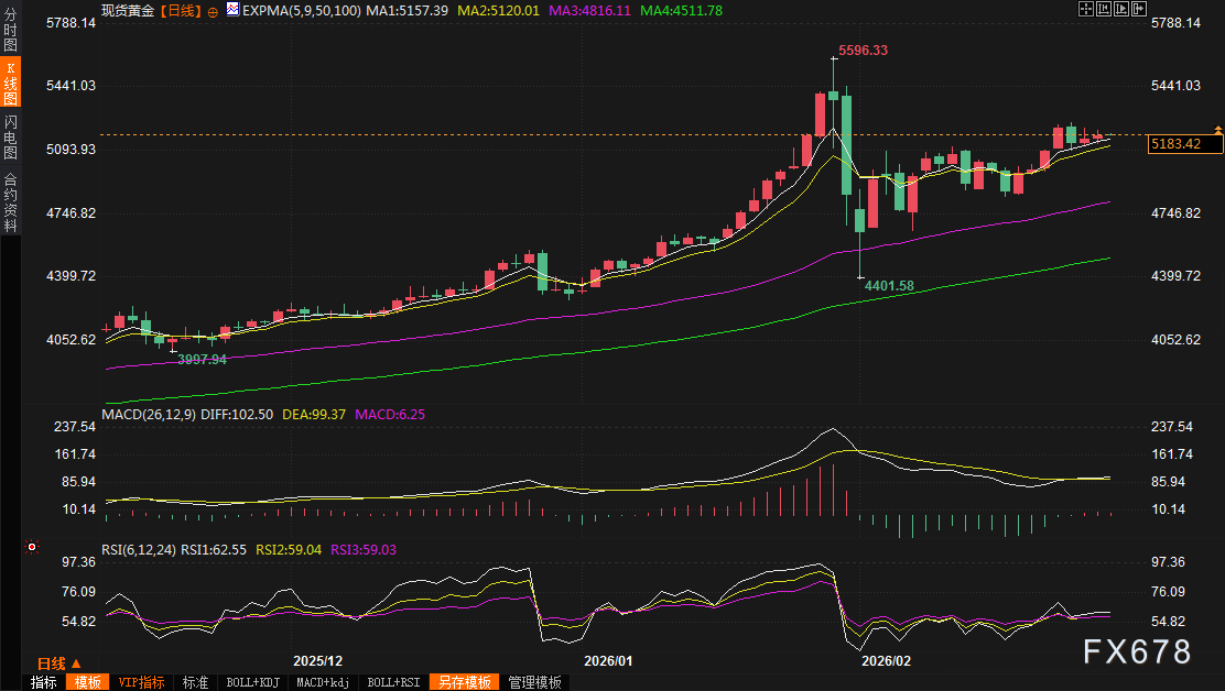 汇通财经APP讯——在全球投资者的屏息以待中,黄金市场正经历着一场微妙的平衡游戏。现货黄金周四(2月26日)维持窄幅震荡,收盘微涨0.4%至5183.88美元/盎司,盘中一度跌至5130美元附近但很快受到逢低买盘支撑;而美国黄金期货则小幅收跌于5194.20美元。这一近乎静止的价格波动背后,隐藏着市场对日内瓦美伊间接核谈判的高度警惕——地缘政治的天平任何微小倾斜,都可能引发金价的剧烈震荡。周五(2月27日)亚市早盘,现货黄金窄幅震荡,目前交投于5184.42美元/盎司附近,