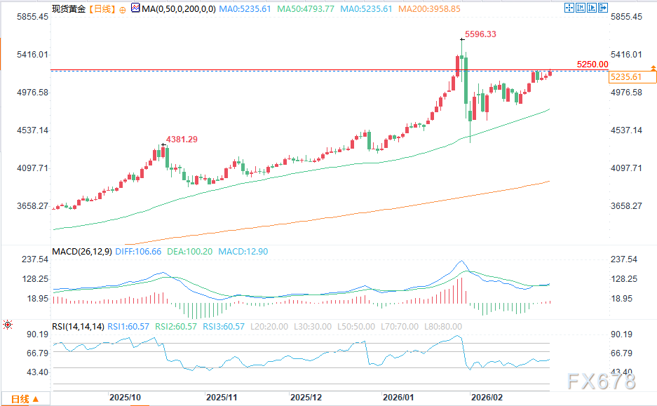 汇通财经APP讯——周五(2月27日)美盘时段,全球现货黄金市场呈现小幅走高的态势,价格持续向一个月以来的高点5250.00美元逼近,市场交投活跃度较前几个交易日明显提升。从日线图表形态来看,5250.00美元不仅是近期的关键阻力位,更是金价能否加速上行、再度挑战历史高点5602.23美元的核心门户——一旦成功突破并站稳该价位,将打开新一轮上行空间,吸引更多趋势性买盘入场。