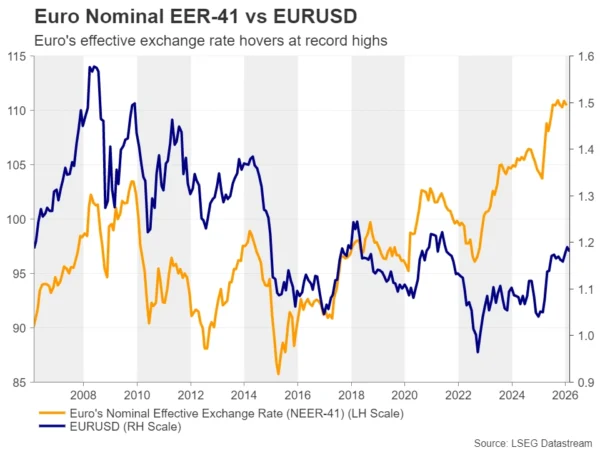 数据显示,欧元区1月整体通胀同比从1.9%放缓至1.7%;剔除食品、能源、酒精和烟草等波动项的核心通胀从2.3%回落至2.2%。若后续通胀进一步降温,市场可能担忧“强势欧元最终拖累经济”,从而推升对欧洲央行未来某个时点“预防性降息”的押注,进而对欧元构成压力。