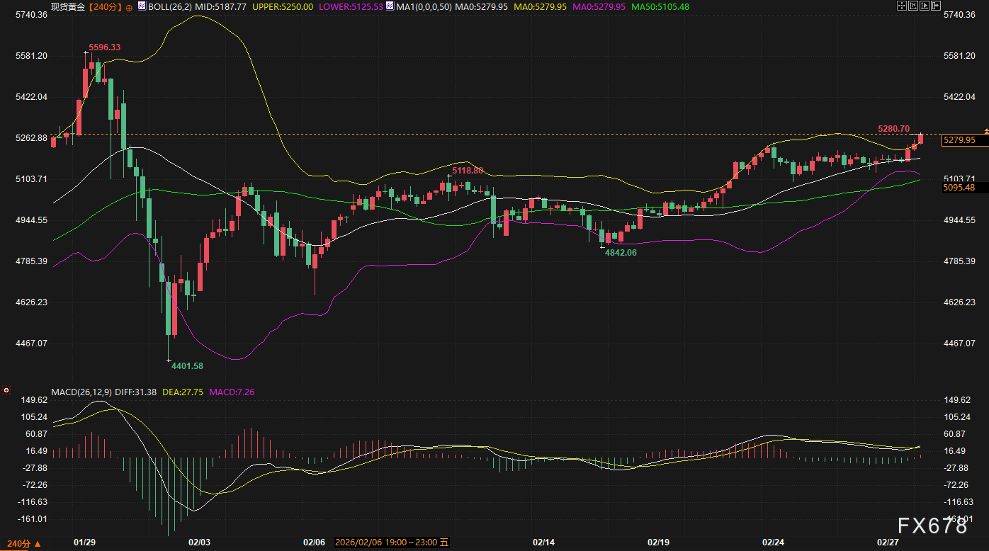 技术面: 周五最高触及5280.70美元,远超布林带上轨(5250.00)。均线多头排列,MACD柱值持续放大。