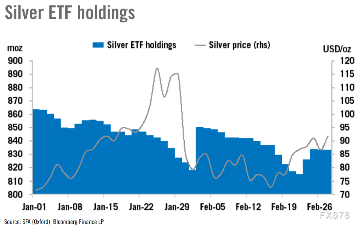白银市场的一个亮点在于ETF投资者的持续热情。上周,全球白银ETF持仓增加超过1800万盎司,价格反弹吸引了更多资金流入。尽管如此,总持仓仍为834百万盎司,低于年初的864百万盎司和12月底的870百万盎司。这表明,虽然短期回暖提振信心,但整体持仓尚未恢复峰值。