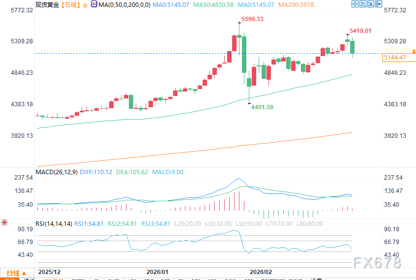 当前短期支撑位在5143.89美元与5002.31美元,若失守,或将下探50日均线4833.30美元。