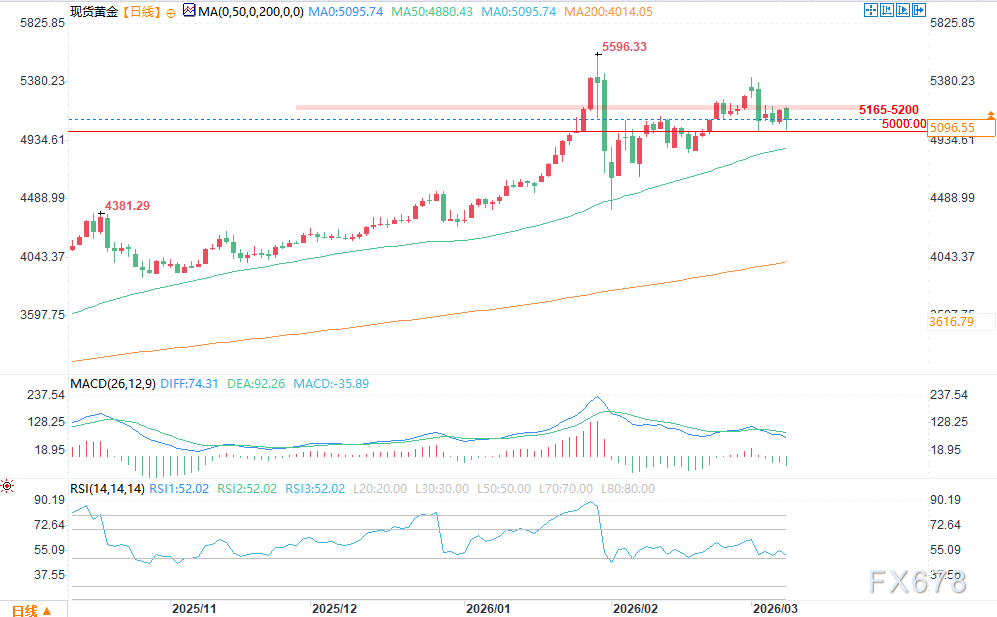从技术面来看,黄金目前的走势处于关键的支撑和阻力区间之间。当前的支撑位在5000–5050美元区间,这一价位在近期多次经受考验,且每次都吸引了买盘的介入。只要金价能够稳定在5000美元以上,市场情绪仍偏向于看涨。然而,一旦金价有效跌破该支撑位,短期内可能会转向空头趋势,迎来进一步的回调。