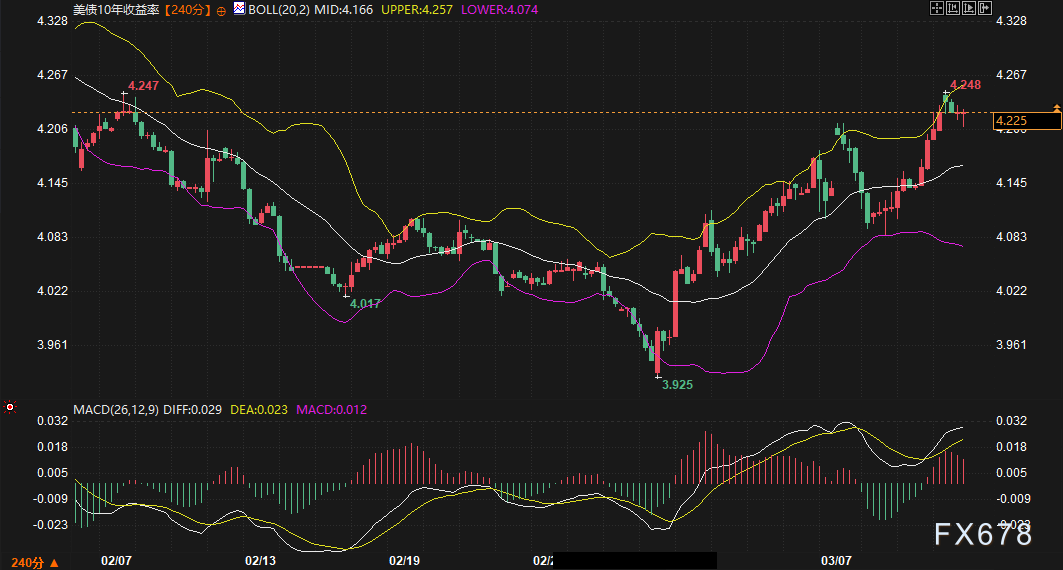 答:最关键的“风向标”是10年期美债收益率的4.25%阻力位。如果收益率强力突破此位,说明市场正在为更长期的通胀风险定价,届时美元可能进一步走高。反之,如果收益率在布林带上轨受阻回落,黄金可能会获得喘息机会,发起新一轮的向上试探。