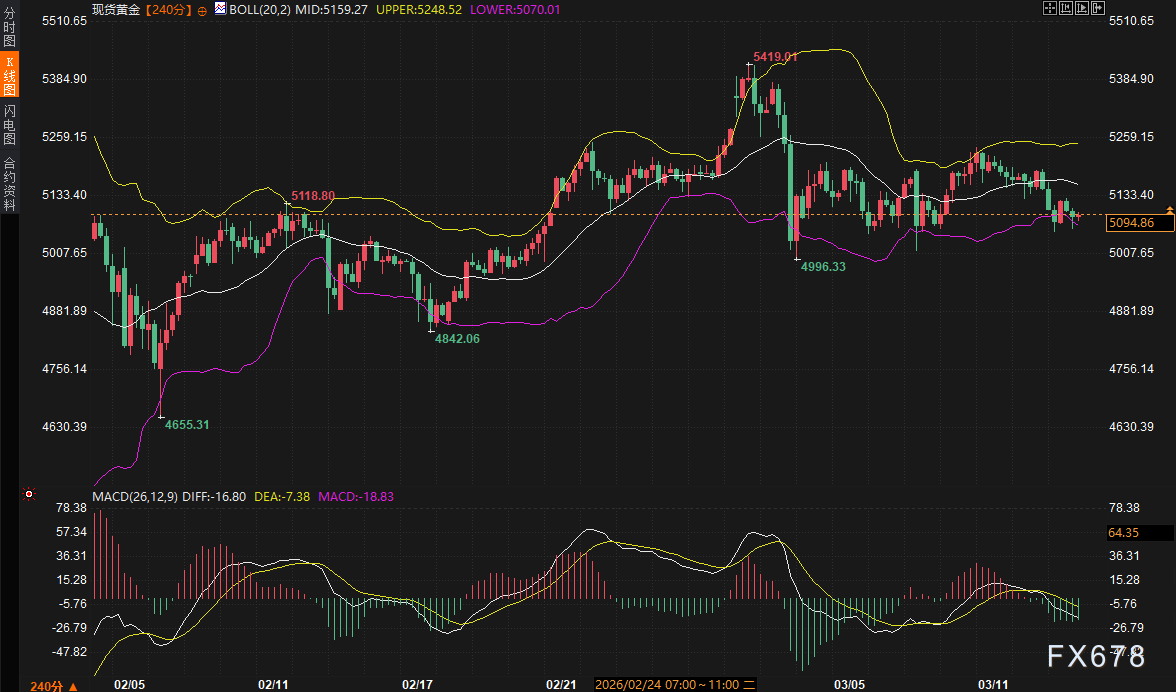 2.技术走势分析: 现货黄金目前报价5094.86,处于布林带下轨5070附近。MACD绿柱持续放大,空头动能仍在释放。K线在5000-5150区间反复拉锯,显示多空双方在5000大关附近存在激烈分歧。