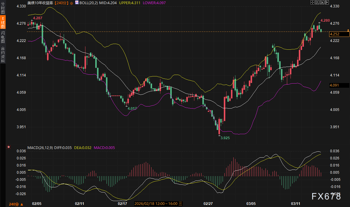 近期美债市场的走势是驱动全球资产定价的核心。10年期美债收益率目前报4.252%,处于布林带中轨4.204与上轨4.311之间的强势区间。从技术形态观察,收益率在2月初触及4.287高点后回落,近期再度回升至4.280附近,形成了清晰的潜在双顶结构。