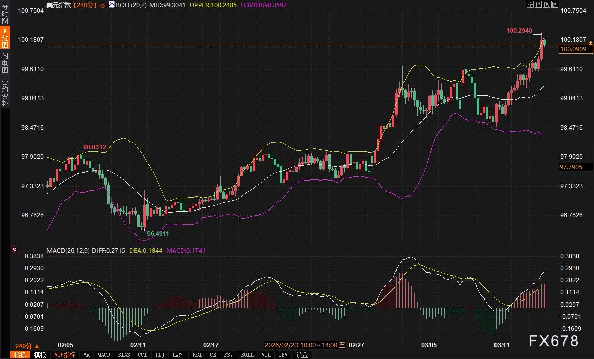 汇通财经APP讯——周五(3月13日),全球金融市场正处于多重宏观压力的交汇点。受中东局势及能源价格波动的持续扰动,美债收益率与美元指数近期表现出极强的同向扩张态势。最新数据显示,美元指数已飙升至100.0909附近,贴近布林带上轨运行,市场避险资金流向美元的趋势显著,这对传统的避险资产——现货黄金形成了明显的挤压效应。