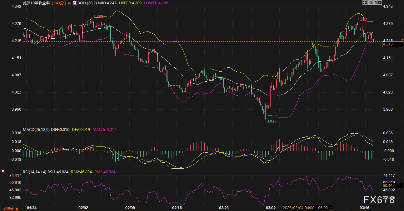 汇通财经APP讯——周二(3月17日),全球金融市场正处于地缘局势高度紧张与美联储议息会议前夕的交织影响中。受中东局势升级影响,原油价格出现剧烈波动,WTI原油一度突破98美元关口,尽管随后涨势有所放缓,但其对通胀预期的传导效应已迅速反应在美债市场。目前,基准10年期美债收益率维持在4.21%上方震荡,反映出市场在避险需求与通胀走升担忧之间的剧烈博弈。