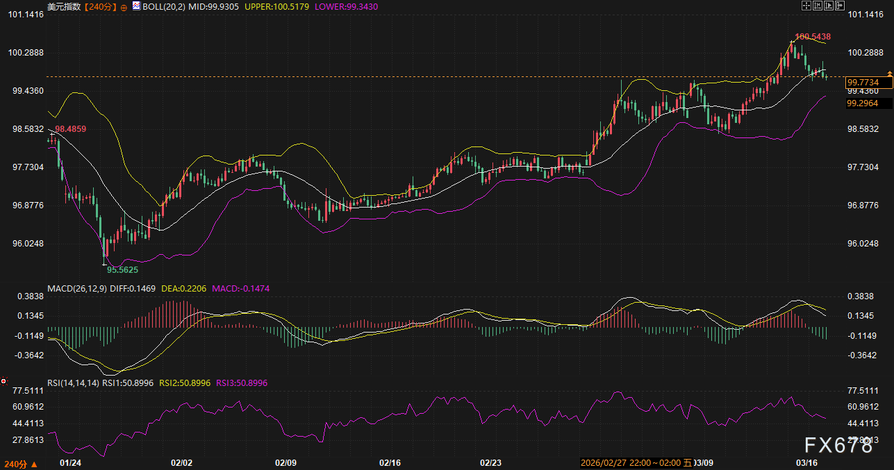 美元走势: 美元指数240分钟线显示,价格已突破布林带上轨,且MACD红柱持续放大。尽管短线受获利盘影响回落至99.77附近,但只要10年期美债收益率守住4.05%—4.10%的关键支撑区间,美元的下行空间将非常有限。目前美元指数在100整数关口附近表现出较强的多头动能,市场正在消化美债收益率高位企稳带来的估值重修。
