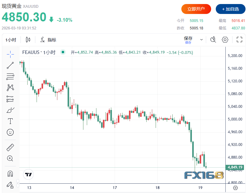 金银、比特币短线走低,其中现货黄金最低触及4843.31美元/盎司。