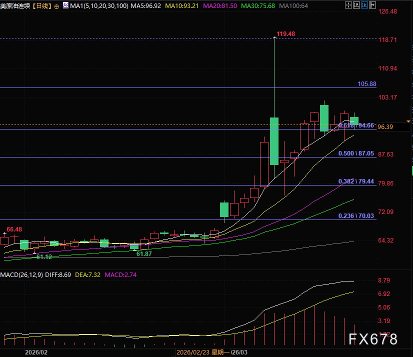 北京时间18:54,现货黄金现报4678美元/盎司,WTI原油期货连续现报96.42美元/桶。