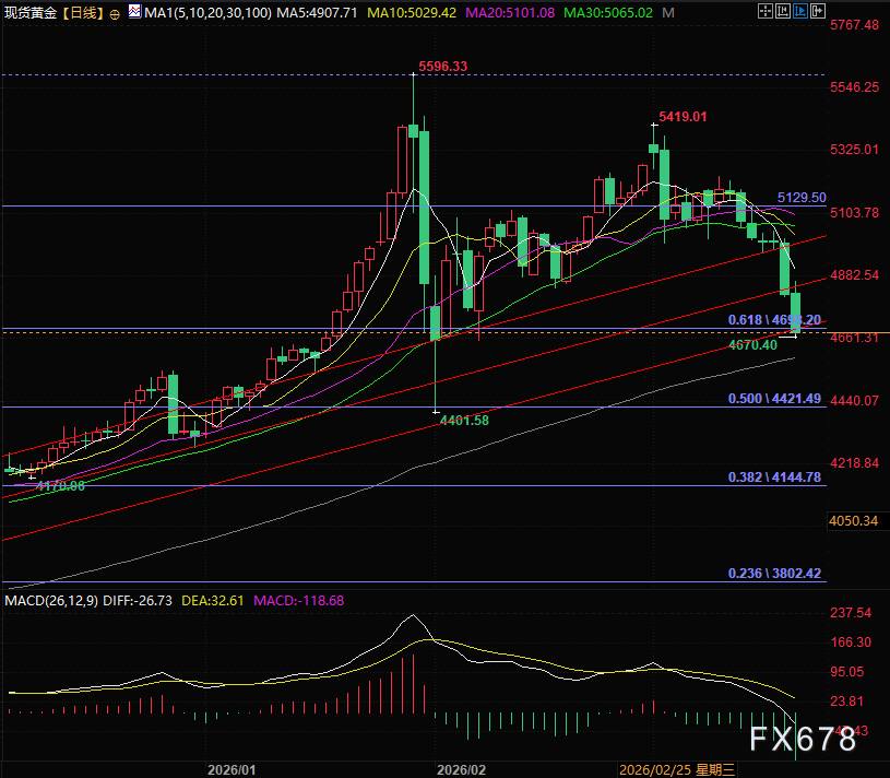 现货黄金跌至通道下轨以及0.618分位处,4700有望成为下阶段的价格中枢,4700以下有分批布局的机会。