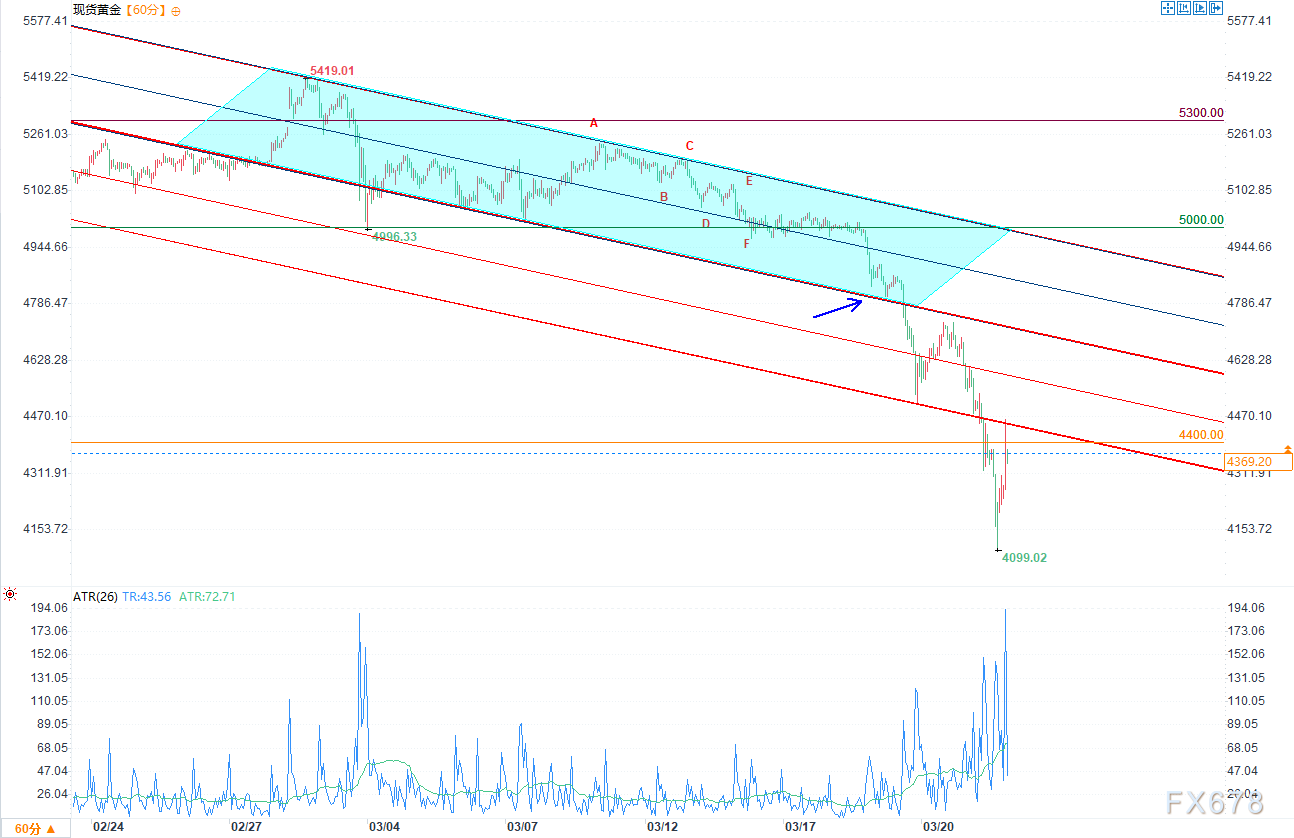 3月16日早间,我们就已识别出金价连续走出更低的高点与更低的低点(形态标记:A–B–C–D–E)。除此之外: