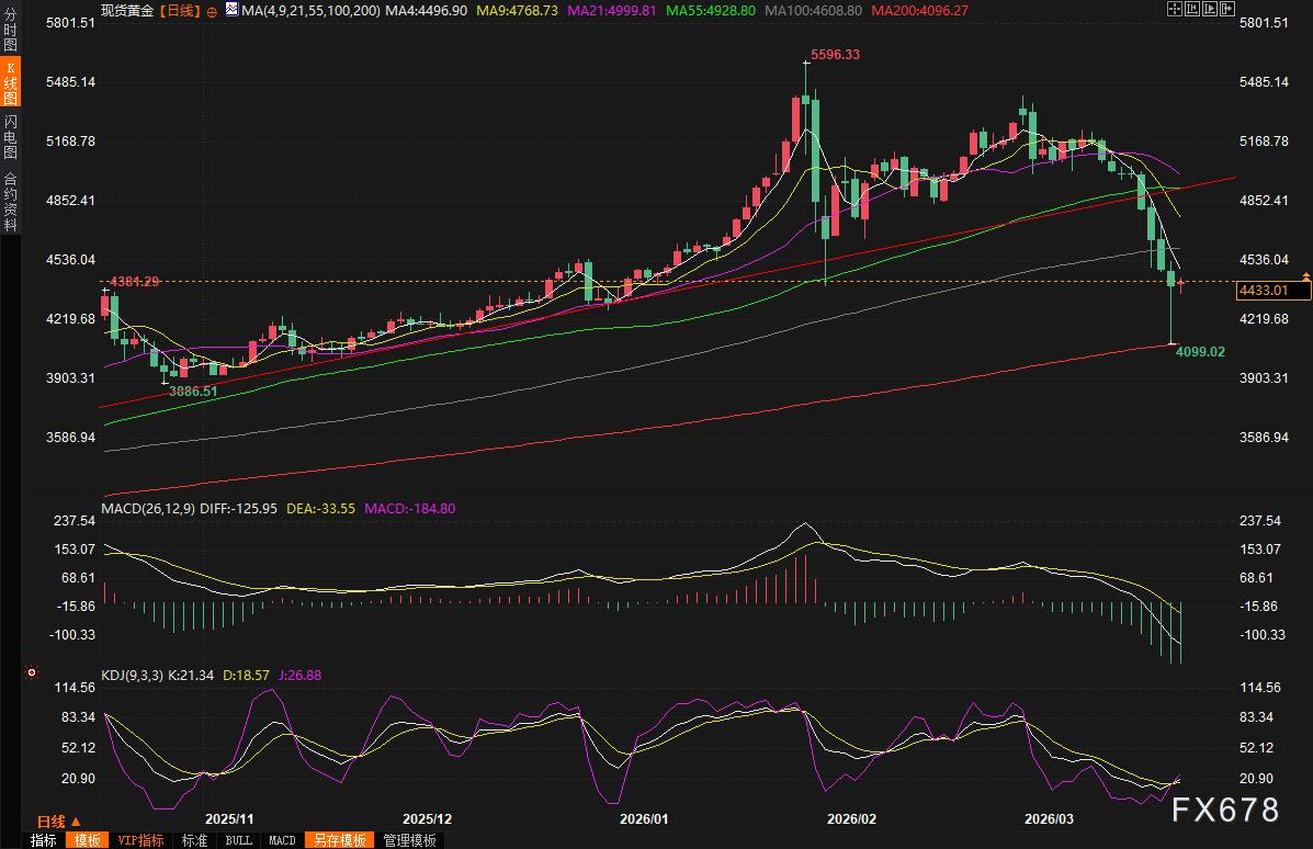现货黄金在这场抛售潮中一泻千里,盘中跌幅一度超过8.7%,触及4099.02美元/盎司的惊人低位,这不仅是四个月来的新低,更令其一度逼近200日均线这一关键的技术支撑位。上周金价已经创下自1983年以来最差的周度表现,而周一的这波急跌,无疑是将其推向了更深的深渊。High Ridge Futures的金属交易总监David Meger精准地描述了当时的情景:“隔夜的抛售是过去几个交易日多头平仓的延续,主要受加息预期推动。” 市场仿佛已经认定了,黄金的熊市才刚刚开始。