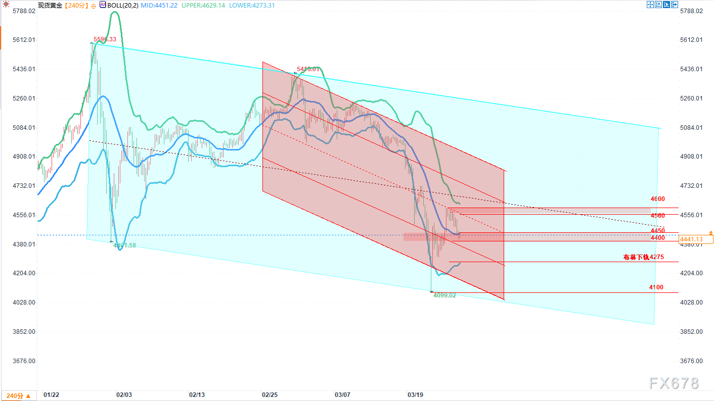 红色次级下降通道嵌套于绿色大通道内部,是3月初局部高点5419之后形成的加速下行子结构。相较于绿色通道,它的斜率更陡峭,反映了跌势的加剧。通过连接这波急跌过程中的高低点,当前通道中轨位于4550-4560区间,次级压力贴近4600,次级支撑则指向4100-4050区间。3月20日金价同步跌破该次级通道中轨后,昨日的反弹尝试在中轨附近遇阻回落,说明短期空头力量仍占主导,多头反攻暂未成功。
