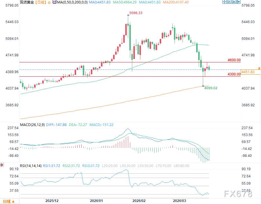 从日线图来看,黄金在4600美元/盎司一线多次受阻,该位置已逐渐形成明确的强阻力区。价格反复冲高未果,本身也强化了市场的抛压预期。