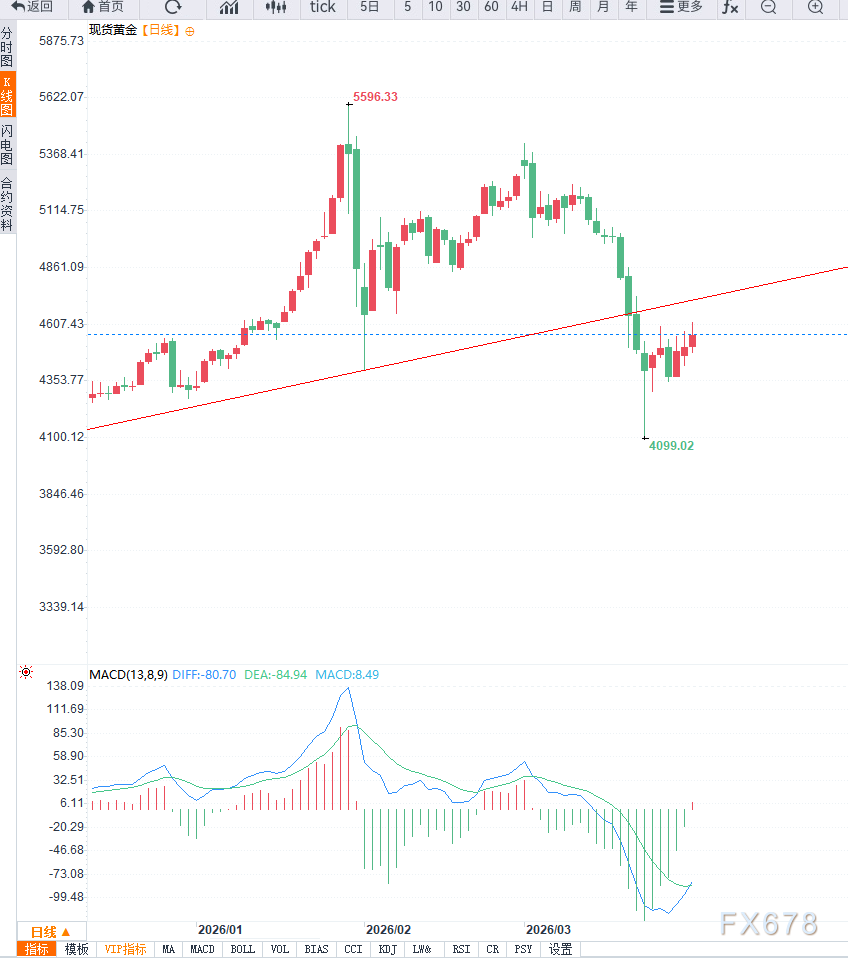 黄金价格延续反弹走势,在连续第三个交易日上涨后,于亚洲时段触及近一周半高点,逼近4600美元关口。此前金价自4100美元附近低点反弹,主要受美元回调与收益率下行支撑,但在关键阻力位附近明显承压,显示多头动能仍显不足。