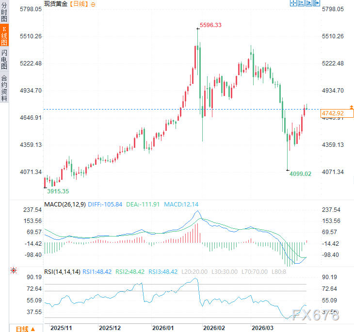 周四(4月2日)亚市时段,现货黄金冲高回落,一度震荡上行达4800.30美元/盎司,而后因特朗普最新发言快速回落近60美元至4724美元,现交投于每盎司4760美元附近%。