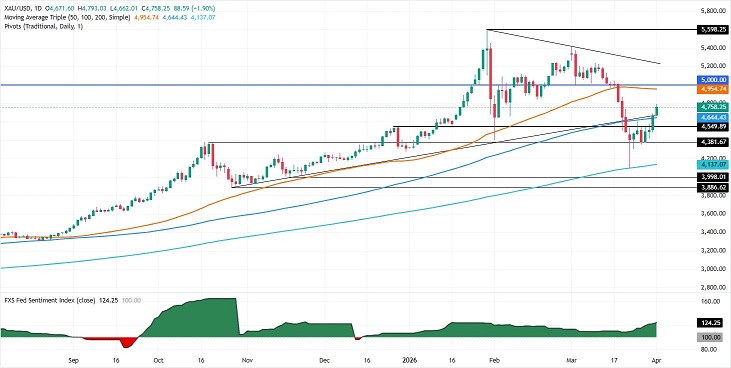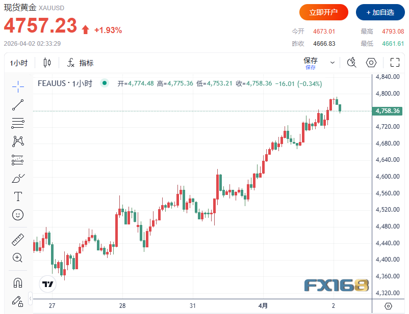 北京时间周四(4月2日)9时,美国总统特朗普发表全国电视讲话,就持续逾一个月的美伊冲突释放重磅信号;同日,伊朗伊斯兰革命卫队发射多枚导弹反击美军中东基地。两大事件共振下,现货黄金短线暴逾100美元,从4800美元/盎司快速下探至4649.53美元/盎司,引发全球金融市场剧烈震荡。