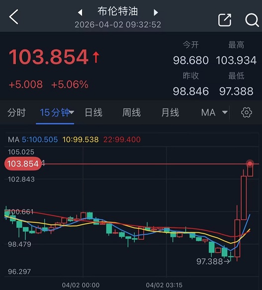 WTI原油期货日内大涨5.00%,报104.08美元/桶。布伦特原油期货日内大涨5.00%,现报103.85美元/桶。