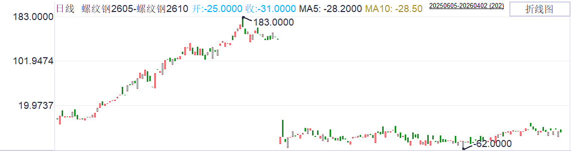 审核:王 莹(投资咨询号:Z0017889) 07.跨期套利:空05多10螺纹钢 现货钢材普遍成交一般,钢联数据公布,上周五大材继续增产,其中螺纹增产速度放缓,铁水产量回升。上周建材表需上升,螺纹库存整体去化,但同比表需仍在下滑。供应压力较大。近期,能源与海运费上涨,带动煤炭跟随上涨,若战争持续加剧,将使钢材原料成本继续抬升。螺纹钢产量回升至年内高位,库存去化有限,供应压力犹存。需求迎来改善,周度表需低位持续回升,但房地产行业疲弱状况并未实质性改变,预计3-4月需求旺季时期对消费提振作用有限。 交易逻辑:进入3月底,近月05合约主力资金大举流出,导致05合约走势相对走弱。05-10差价负值扩大。高库存下,产业套保盘锁定现货销售利润,近月价格承压。远月合约政策面看好,传统“金9银10”消费旺季,需求有一定提振空间。故此资金流入,持仓量持续增加,对价格形成支撑。 套利策略:该策略为跨期套利交易策略,建议关注2605月和2610月合约反套机会。目前05-10价差=-30,通常表现为负值继续扩大,预计反套策略可能存在一定机会,建议关注。 风险提示:若4月出现超预期降库或突发限产情况,近月空头被迫平仓,资金大举回流05合约,将导致价差收窄,则立刻取消关注。