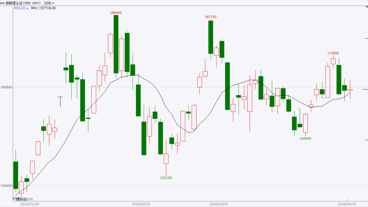 审核:李 琦(投资咨询号:Z0017426) 04.碳酸锂主力合约:日内震荡 截至前一个交易日收盘,碳酸锂主力合约日内宽幅震荡,表现乏力。 走势分析:前期由供应端扰动引发的情绪溢价已基本消化,市场重新聚焦于长期供需宽松格局。近期盘面呈现宽幅震荡特征,多空博弈较为激烈,但基本面并未出现实质性改善。供给端,海外矿山投产推进顺利,中长期产能释放预期较为明确;需求端,下游采购维持谨慎,补库力度有限,对高价货源接受度较低。展望后市,在供过于求的大背景下,碳酸锂长期价格中枢或仍面临下行压力,短期则延续震荡反复格局。