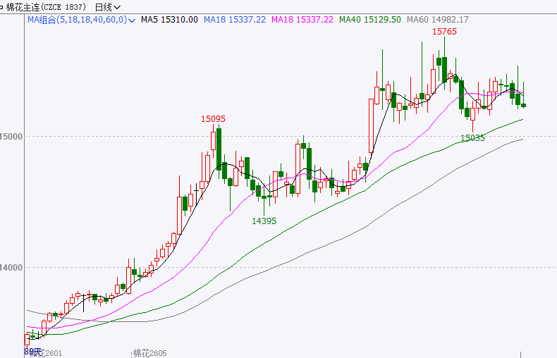 审核:张国军(投资咨询号:Z0019540) 03.棉花主力合约:冲高回落 截至前一个交易日收盘,棉花主力合约冲高回落,收小阴K线。 走势分析:今日行情冲高回落,棉花供应宽松,后续有望震荡偏弱运行,下方支撑位参考15000附近,上方压力位参考15550附近。