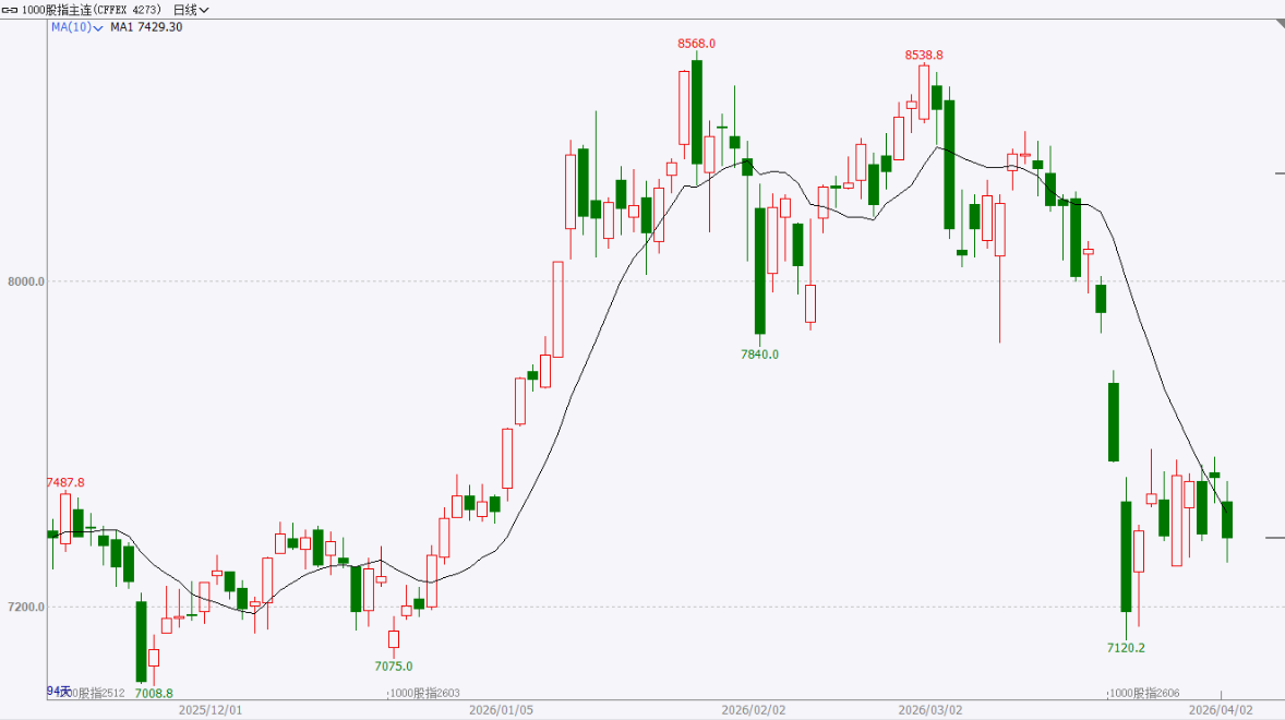 审核:王 莹(投资咨询号:Z0017889) 05.中证1000主力合约:小幅下跌 截至前一个交易日收盘,中证1000主力合约日内小幅下跌,临近短期低位支撑。 走势分析:4月财报季窗口下,市场从小盘题材股向业绩确定性品种切换,叠加两市成交缩量,对小盘股估值形成挤压。展望后市,IM短期或延续震荡偏弱格局。
