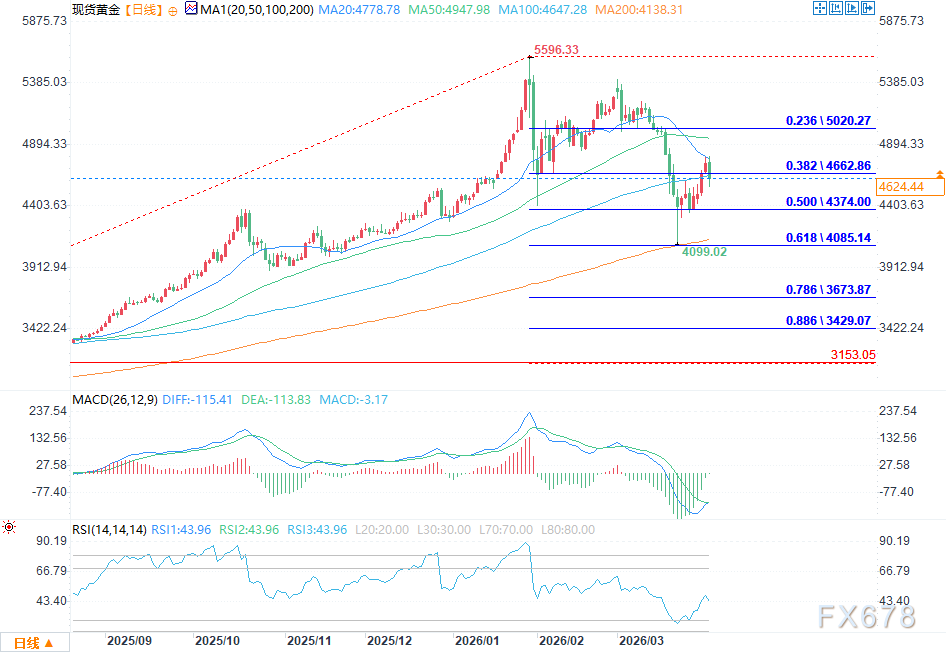 黄金价格此前从200日简单移动平均线(200SMA)附近启动反弹,但在触及4800美元关键阻力位时遇阻回落——该价位同时也是20日简单移动平均线(20SMA)所在位置,具有双重技术阻力意义。随后金价震荡下行,目前已下破4650美元支撑位(该水平对应着从3150美元低点至5598美元高点这一波上涨行情的38.2%斐波那契回撤位),当前正测试4600美元整数关口支撑,成为短期技术面的重要防守关口。