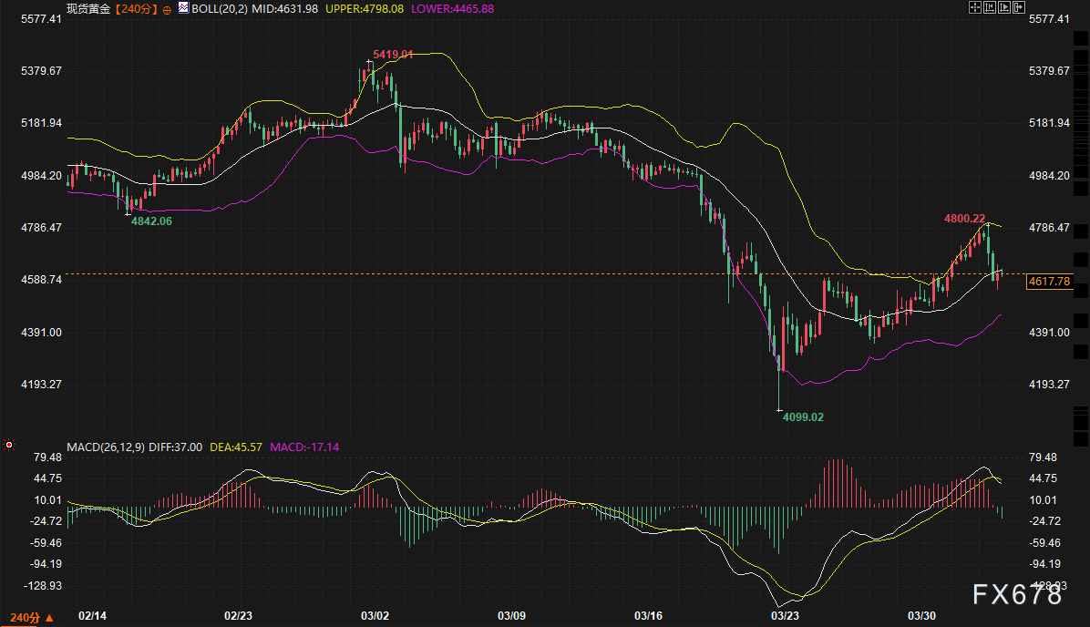 技术面上,金价已跌破布林带中轨,并呈现出反弹遇阻后的震荡走弱特征。若金价不能快速收复4631附近的阻力位,短期内确实存在回试4465支撑位的风险。但长期来看,黄金的结构性需求(如央行购金)依然存在,目前的下跌更多是针对3月大幅波动的技术性修正和对利率环境的重新定价。