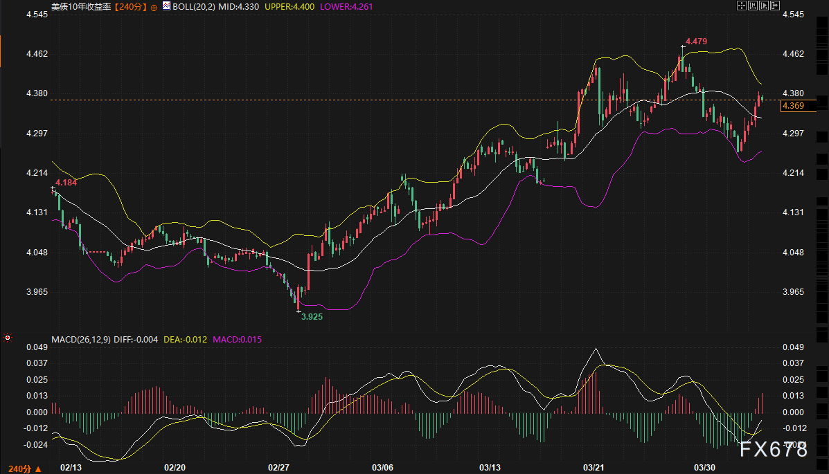 近期美债市场的波动是驱动美元走强的关键引擎。从技术面观察,10年期美债收益率目前报收4.369,正处于高位震荡区间。尽管3月下旬曾出现回落,但在布林带中轨4.330附近获得了强力支撑。MACD指标显示,DIFF即将上穿DEA形成金叉,红柱由负转正,这预示着短期下跌动能已基本耗尽,多头力量正在积聚。