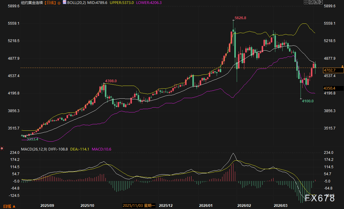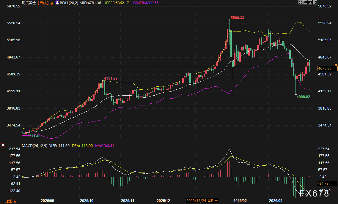 目前日线级别MACD红色动能柱开始扩张,DIFF线与DEA线虽然仍处于零轴下方,但底背离形态已然清晰。布林带方面,价格已从下轨(4200.55美元)反弹至中轨附近。海外主流机构认为,4781美元的中轨阻力位将是下周多空争夺的“天王山”。