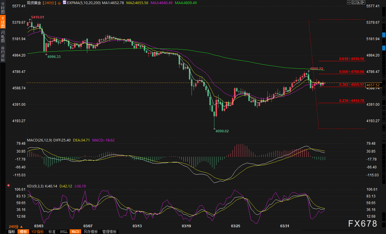 4600美元这一位置恰好对应3月下跌走势的38.2%斐波那契回撤位,具有重要的技术意义。若黄金能够有效站稳该位置,或将迎来进一步修复;但若失守,则可能引发更深层次的回调。