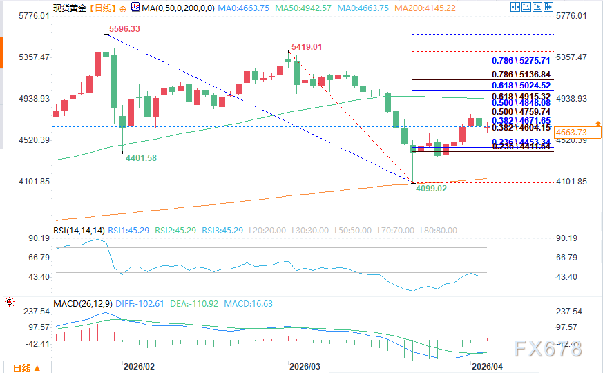 汇通财经APP讯——周一(4月6日)美盘午盘时段,现货黄金小幅走低,但整体稳定在上周四形成的价格区间内。这种区间内震荡的走势,清晰反映出投资者当前的犹豫情绪,也预示着后续可能出现较大波动。从技术面来看,交易员正被困在多个回撤位之间,这些价位既为看涨观点提供支撑,也为看跌情绪提供依据;从基本面来看,看涨投资者密切关注当前正在进行的停火谈判,期待局势缓和带来避险买盘,而看跌投资者则担忧美国与伊朗之间的冲突进一步升级,可能引发市场风险偏好变化,压制黄金涨幅。