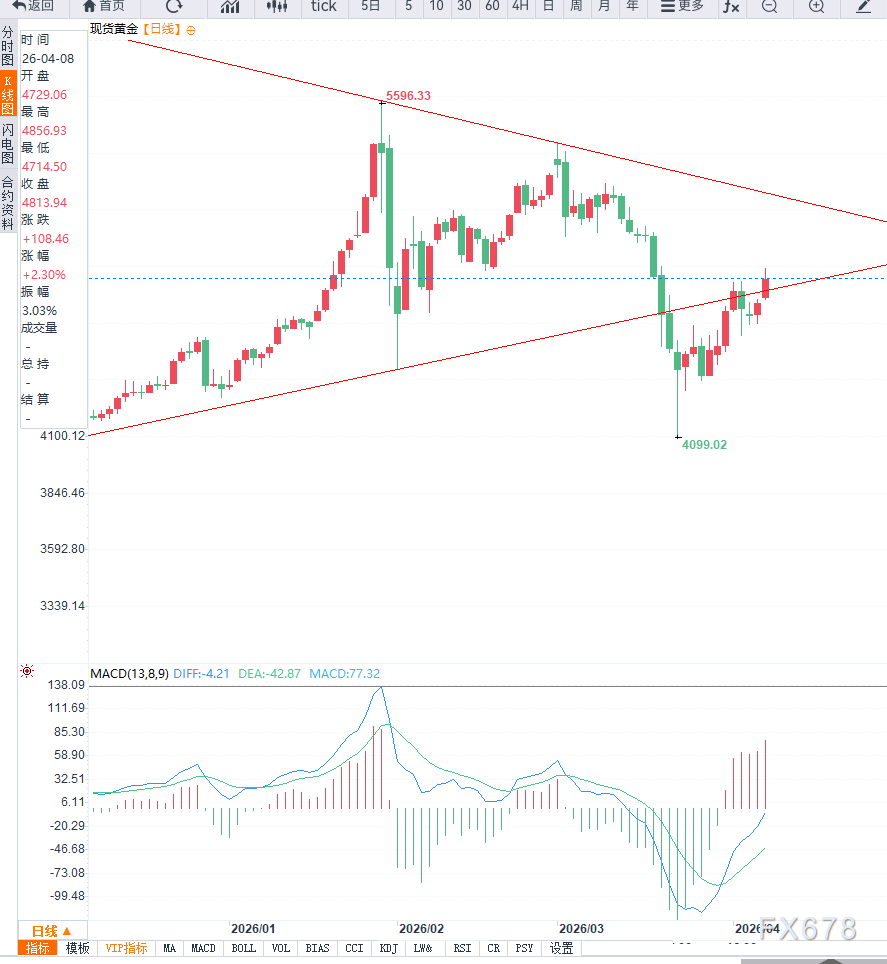 汇通财经APP讯——国际黄金市场在周三亚洲时段延续震荡上行走势,金价一度逼近4815美元/盎司,显示出在复杂宏观环境下的韧性表现。尽管中东局势出现阶段性缓和,美国总统特朗普宣布暂停对伊朗军事行动两周,但黄金并未出现明显回落,反而吸引部分资金重新布局。