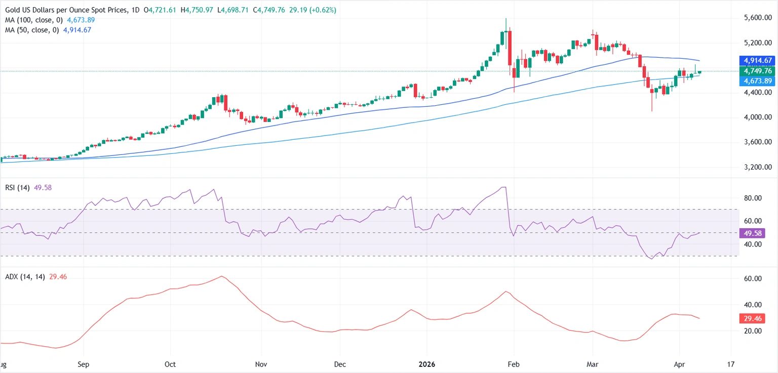 FXStreet指出,从日线图来看,XAU/USD目前在关键均线之间来回波动。金价守在100日简单移动平均线(SMA)4673.84美元上方,但仍运行在50日SMA 4914.57美元下方,这意味着在近期回调之后,短线基调整体仍偏中性。 相对强弱指数(RSI)报49.33,基本位于中轴附近,显示市场动能偏平。平均趋向指数(ADX)报29.46,暗示当前存在一定趋势性,但并不强烈,这意味着在出现明确突破之前,价格可能继续在当前区间内整固。 上行方面,50日SMA 4914.57美元构成初步阻力。若日线收盘有效站上这一水平,将重新打开通往前高的空间,并推动市场重新转向多头主导。 下行方面,初步支撑位于100日SMA 4673.84美元附近。若金价持续跌破这一水平,可能引发更深层次的调整,也将释放出空头重新占据主导的信号。