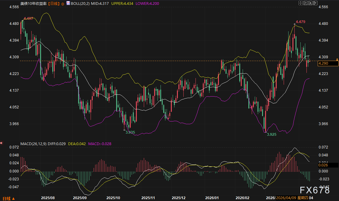 近期,美债10年收益率呈现出典型的“冲高回落”态势。从技术面看,当前收益率报价维持在 4.290% 附近,运行于布林带中轨 4.317% 下方。MACD 指标显示 DIFF 线已下穿 DEA 线形成“死叉”,且绿柱持续释放,预示短期内收益率仍面临一定的下行压力。